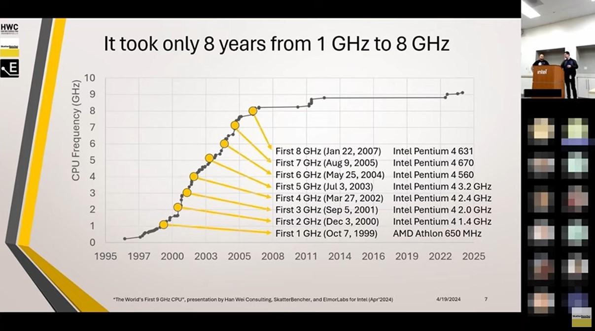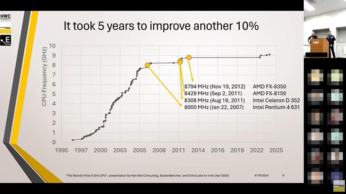 Pour la vidéo qui nous intéresse, elle est intéressante à plusieurs égards. Déjà, elle montre à quel point la marge de manœuvre en matière d'overclocking tend à diminuer depuis 2007, année où les 8 GHz ont été atteints pour la première fois. D’ailleurs, pendant plusieurs années – depuis 2012 ou 2014 selon que vous référez à CPU-Z ou à HWBot – les AMD FX ont dominé le classement. En se basant sur celui du premier, un AMD FX-8350 poussé à 8794,33 MHz par Andre Yang régnait depuis 2012 ; un AMD FX-FX-8370 cadencé à 8722,78 MHz en prenant HWBot pour référence (performance réalisée par The Stilt). Une certitude : il a fallu attendre 2023 et un exploit d’un Core i9-13900K pour dépasser ses sommets.