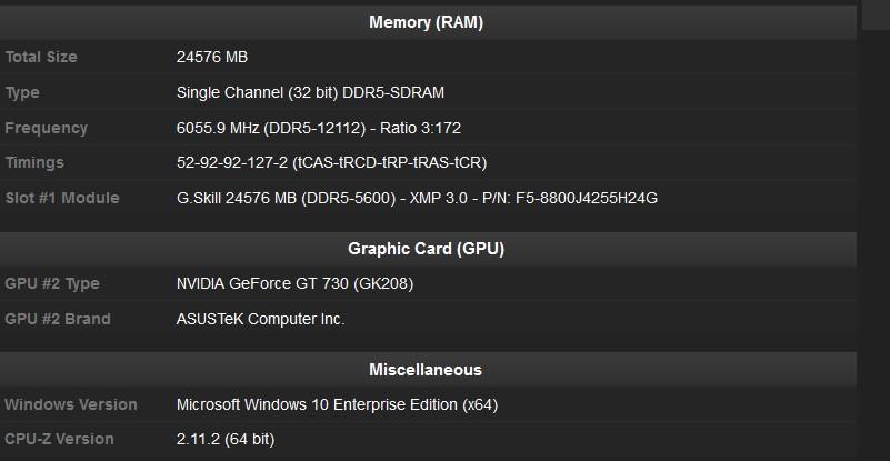 Notre dernier article traitant d'un record de fréquence pour la DDR5 remonte à février 2022 ; il portait alors sur une barrette G.Skill poussée à 4779,7 MHz, soit de la DDR5-9560. Deux ans et demi plus tard, nous retrouvons un module de l’entreprise taïwanaise, mais évoluant à des vitesses bien plus élevées : 6055,9 MHz, ce qui correspond théoriquement à de la DDR5-12112.