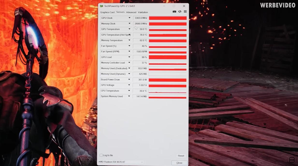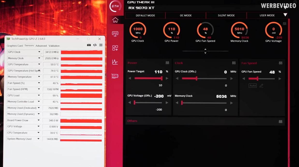 En configurant manuellement les ventilateurs à 49 % (environ 1600 tr/min) de leur vitesse maximale, Roman parvient à monter le GPU à 3030 MHz. Avec une limite de puissance définie à 110 % (360 W), il le pousse à 3120 MHz environ. C’est finalement via un undervolting de 200 mV que la Radeon RX 9070 XT frôle les 3,4 GHz. Cette configuration n’est toutefois pas stable sur la durée. Roman finit par remonter à -170 mV. Il obtient alors une fréquence GPU d’environ 3360 MHz, soit 300 MHz de plus qu’initialement. La fréquence GPU augmente elle aussi : de 2505 MHz, elle grimpe à 2686 MHz.