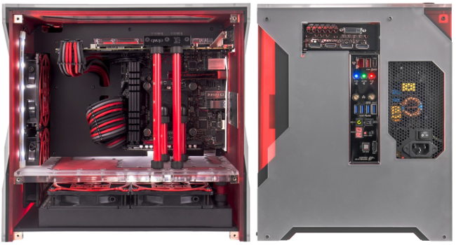 Avec ce CV musclé, le bonhomme propose souvent des modèles custom de GPU ou carrément des PC montés par ses soins et c'est le cas de l'Asteroid. Dans un boîtier custom (sur base de chez Parvum à double compartiment) au format mini-ITX (275 x 332 x 430 mm quand même), le gaillard nous colle une GTX 980 Ti aux hormones (ou GTX Titan X en option), un Intel Core i7-6700K à plus de 4,7GHz posé sur une mobale ASUS Maximus VIII Impact qui a la tête en bas, le tout refroidi par de la flotte grâce à des composants de chez EK et un réservoir intégré au boîtier (la plaque cheloue sur le bas). Côté mémoire, on a deux fois 4Go de DDR4-3866 de chez Team Group (option pour 16Go de DDR4-3733 disponible) et, pour le stockage, deux SSD 850 Evo de chez Samsung, un 512Go pour le système d'exploitation (Windows 10 ou Windows 7 SP1) et un 1To pour les données/jeux. Pour alimenter tout ce beau monde, il colle une Leader Titanium 1000W de chez SuperFlower, histoire de faire bonne mesure.