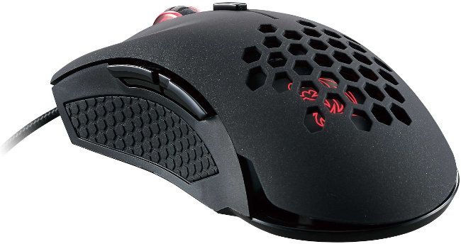 L'engin mesure 128,8 x 71 x 42,6mm et embarque trois poids de 4,5g. Sous son,châssis alvéolaire, on retrouve un capteur laser Avago à 5700DPI, ajustable à 400, 800, 1600 et 3200DPI via le bouton qui se situe sous la molette, et une mémoire de 128ko. Ses 6 boutons pourront être configurés et différents profils sauvegardés via un nouveau soft spécialement dédié à cette souris. En bonne souris gaming, elle a le droit à du rétroéclairage (rouge) à l'avant comme à l'arrière qu'il sera possible de désactiver via deux petits switchs situés en dessous. Elle devrait être rapidement disponible au tarif conseillé de $49,99.