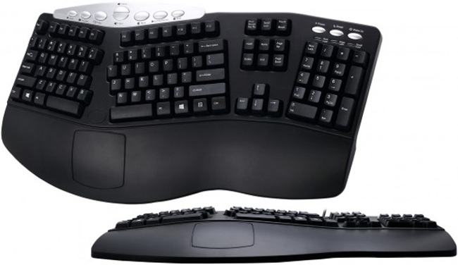 Ne cherchez pas de N-Key Rollover, antighosting ou autre sur cet engin, il est destiné à un usage bureautique et plus particulièrement à ceux qui passent de longues heures à rédiger sur leur PC. La forme bombée du clavier et la séparation du pavé alphabétique permet de placer les mains dans l'axe des épaules de l'utilisateur, sans se dévisser le dos et en évitant de forcer sur les poignets. La position idéale de frappe au clavier (ou pour tenir une souris) étant très proche de celle que l'on prend en saisissant une balle de tennis, c'est l'effet recherché par ce clavier. Histoire d'être fonctionnel, il embarque tout de même quelques touches multimédias et de réglage du son. Annoncé au prix conseillé de 39,95€, ce bestiau qui vient concurrencer des références connues de chez Microsoft devrait avoir le droit à un test sauce Comptoir d'ici peu !