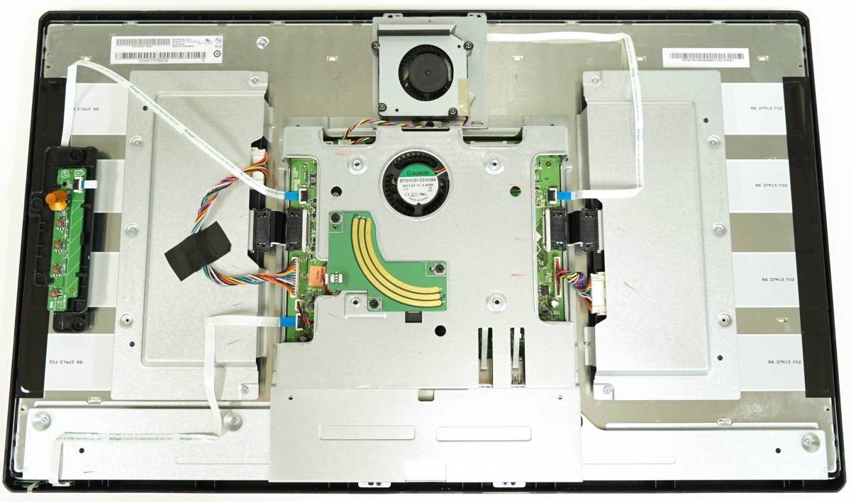 Le layout de l'écran semble divisé en trois parties, avec les supposés modules de contrôle pour le backlight FALD 384-zone de chaque côté. Ceux-ci sont ensuite connectés à un PCB central sur lequel sont aussi attachées les prises de sorties vidéo, et c'est lui qui s'interface directement avec la dalle LCD M270QAN02.2 AHVA IPS d'AUOptronics. Sur la partie centrale se situe également le module G-Sync HDR tout neuf, mais pour y accéder il faut retirer le radiateur et le ventilateur de type blower. L’opération permet aussi de confirmer que le système de refroidissement est bien là majoritairement pour refroidir la partie G-Sync.