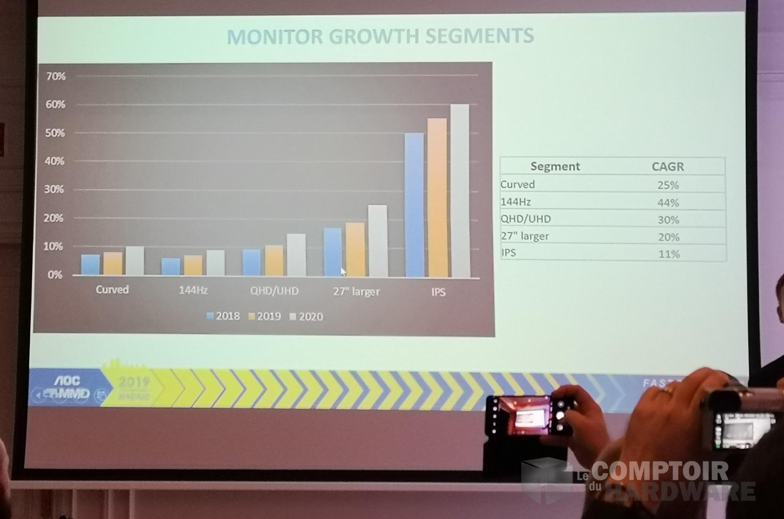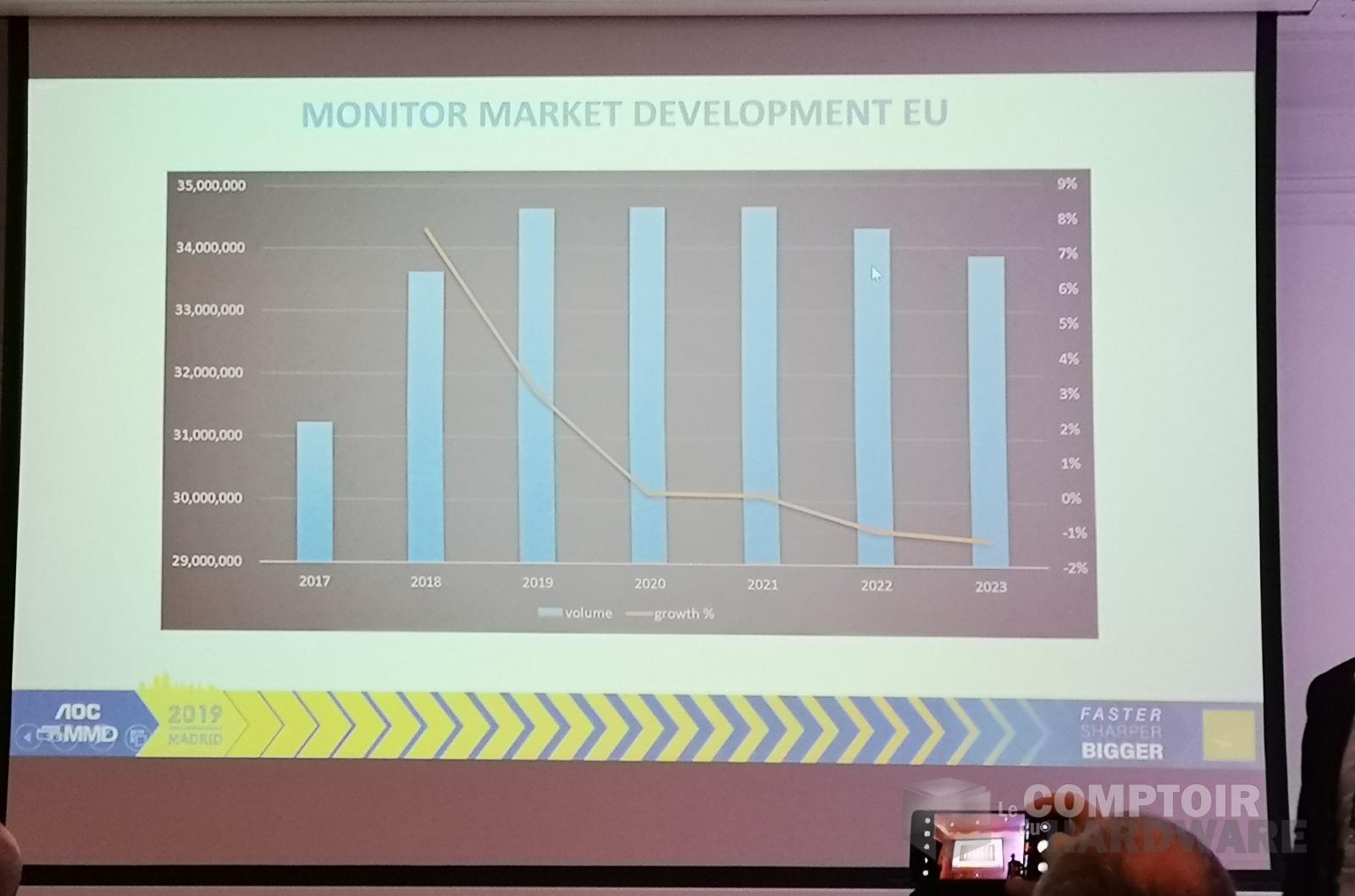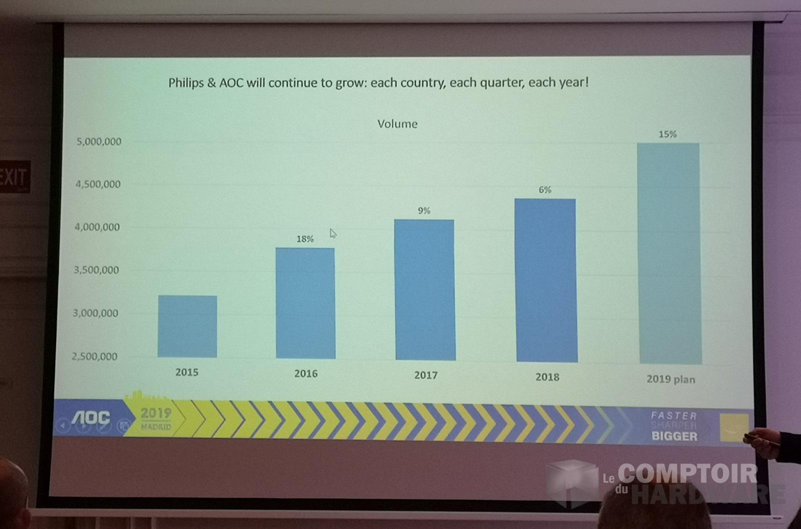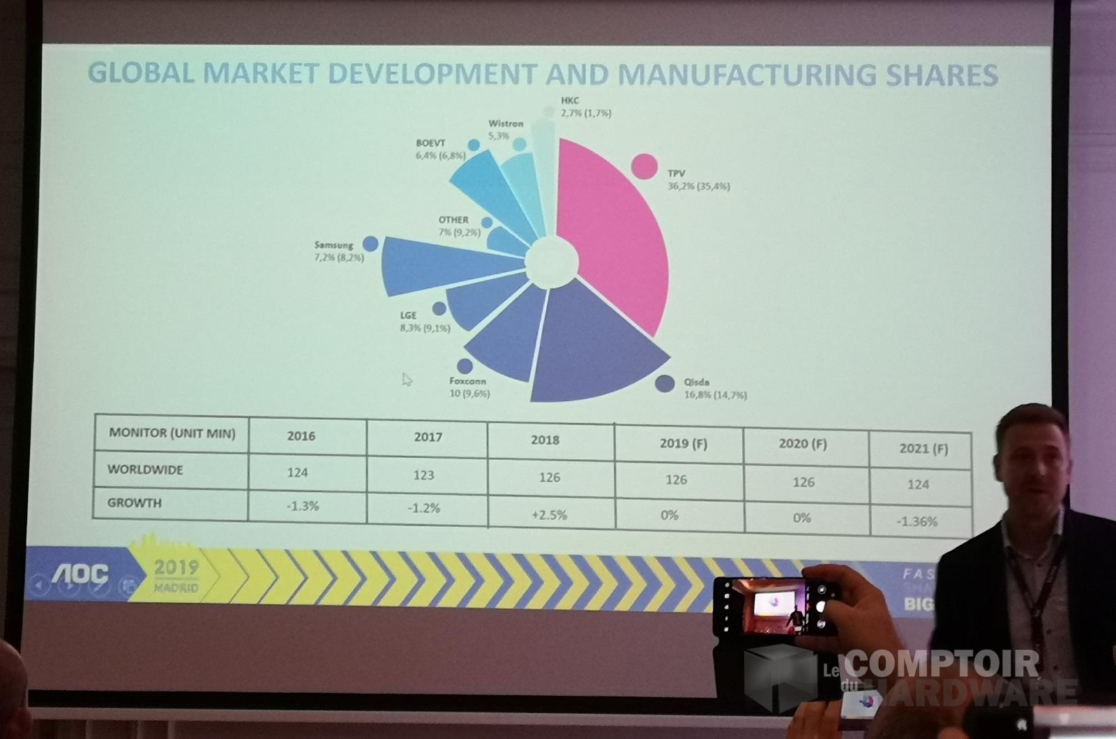 Dans un premier temps, Stefan Sommer - Directeur Marketing et Business Management EU - a mené la charge, graphique trokoül à l'appui, pour faire le point sur le marché de l'écran en général, notamment les projections de croissance et la distribution actuelle des parts de marchés, puis plus spécifiquement sur ce qui attendrait AOC et Philips au bout du tunnel de 2019. Enfin, Stefan a aussi causé des grosses tendances du moment sur le marché, qui ne surprendront vraiment personne, mais c'est toujours très intéressant à voir et donne une idée des types de produits qu'il faut s'attendre à voir venir ces prochains temps, chez l'un, comme chez l'autre.