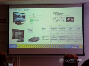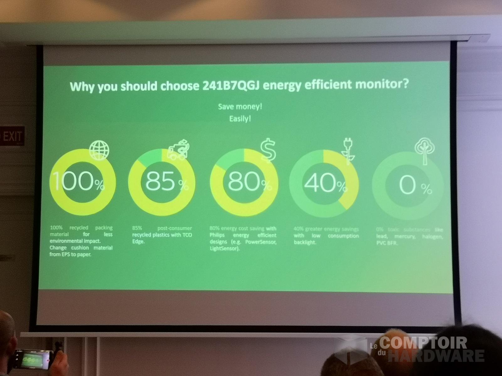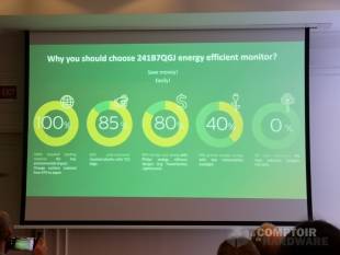 On mentionnera rapidement aussi le 241B7QGJ et la nouvelle gamme d'écrans tactiles "Touch". Concernant le premier, c'est l'écran de choix des plus consciencieux et des écolos. Ses caractéristiques sont certes très basiques - 23", IPS et 1080p -, mais il se distingue par l'usage d'un emballage et de matériaux presque exclusivement recyclés, et une consommation très basse de seulement 11W, ce qui lui vaut aussi une étiquette A++. Présenté en janvier, il n'est pas encore disponible en France, mais devrait y afficher un tarif de 229€. De leur côté, les écrans Touch de la gamme B Line s'adressent à des milieux bien plus spécifiques - magasins, hôtels, restaurants, éducation... -, ils sont pourvus d'une protection IP54, une dalle tactile 10 points et un pied pliable. Le premier modèle est prévu pour avril, le lancement de la gamme devrait ensuite s'étaler progressivement jusqu'au troisième trimestre de l'année.