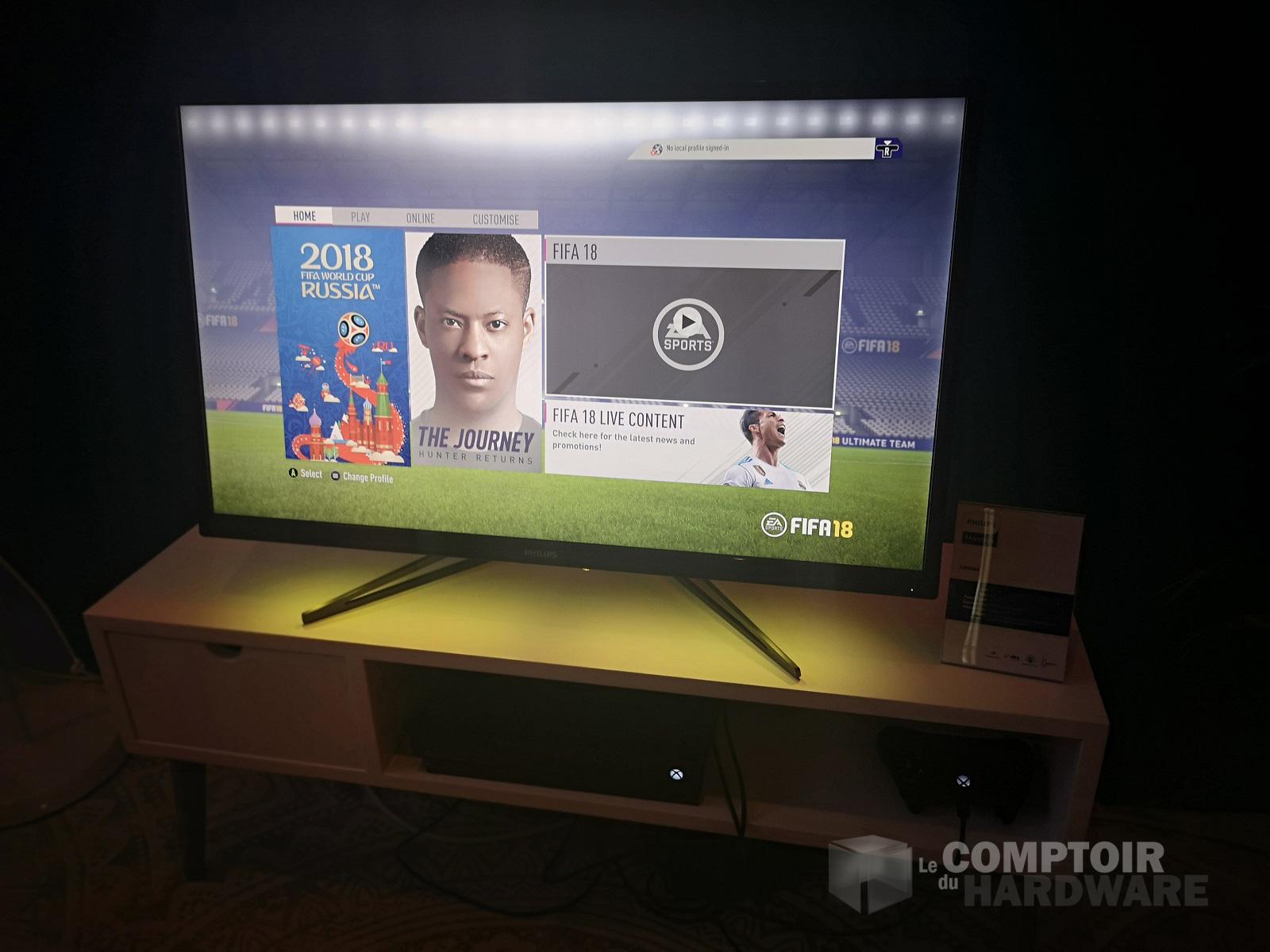 Finalement, Artem Khomenko a terminé son tour de piste avec le Momentum 326M6VJRMB, une autre référence annoncée un peu avant l’événement et qui devrait être disponible à partir de ce mois-ci pour 599€. Sur la table, un écran 32" avec la technologie d'éclairage ambiant Ambiglow du constructeur, mais surtout une dalle MVA 4K UHD, une certification HDR600 et de l'Adaptive sync. Une référence que Philips semble envisager plutôt pour un usage dans le salon avec une console que sur un bureau, en dépit d'une diagonale peut-être un peu juste pour jouer depuis un canapé. Cela-dit, rien n’empêche de placer une console sur un bureau.
