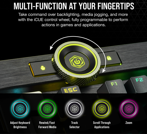 Par exemple, c’est avec le K100 que débute la technologie d’hypertraitement Corsair AXON, dont la particularité est d’offrir un taux d’interrogation et une analyse de touche à 4000 Hz — contre 1000 Hz sur un clavier standard. Apparemment, cela devrait permettre un enregistrement 4x plus rapide des frappes par rapport à un clavier conventionnel. Toujours dans un esprit de vitesse, le K100 est proposé avec des Cherry MX Speed, mais plus notablement aussi avec les nouveaux interrupteurs optiques-mécaniques Corsair OPX, qui proposent un actionnement à seulement 1,0 mm ! Visiblement, les interrupteurs mécaniques au fonctionnement optique sont devenus le nouveau dada des claviers haut de gamme. Razer y fait déjà depuis un moment et Roccat aussi a emboîté le pas très récemment — pour servir une nouvelle génération de gamer qui va probablement finir par taper plus vite que l’ombre de leur main…