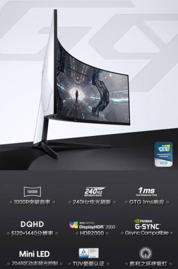 Justement, l'apparition de l'écran sur le site d'e-commerce Taobao permet de déjà confirmer certains points, tout en restant un peu prudent, il est déjà arrivé que des erreurs se glissent dans ces préréférencements du site chinois. Néanmoins, comme on pouvait le pressentir, l'Odyssey G9 2021 reprendra a priori la très grosse majorité des caractéristiques du modèle précédent, y compris son châssis blanc avec un peu de RGB aux fesses. Par contre, le local dimming ridicule sur 10 zones du premier G9 laissera sa place à un rétroéclairage sur 2048 zones, évidemment grâce à la présence désormais des Quantum mini-LED du constructeur. C'est également un gros cran au-delà du rétroéclairage FALD qui plafonne à 1152 zones ! La qualité du HDR devrait ainsi être incomparable par rapport au LC49G95T et à la majorité des écrans certifiés HDR de ce bas monde, avec blooming et halo lumineux réduits au minimum. À ce sujet, le S49AG95NC serait aussi bel et bien certifié DisplayHDR 2000, sous-entendant une luminosité en pointe de 2000 cd/m² et le contraste statique passerait à 4000:1. Il s'agit là d'un niveau de certification qui n'existe pas encore officiellement chez VESA dont le programme s'arrête pour l'instant à DisplayHDR 1400, celui-ci pourrait donc être officialisé simultanément à l'écran de Samsung.