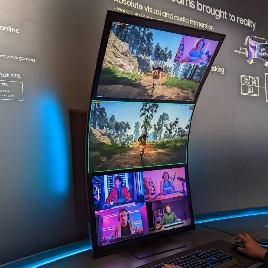 Un combo déjà particulièrement inhabituel, mais ce n'est pas tout. L'Odyssey Ark sera également équipé d'un pied très haut permettant à l'écran d'être pivoté en mode portrait à 90°, une flexibilité qu'il ne nous a encore jamais été donné de voir jusqu'à présent pour un écran incurvé et c'est accessoirement relativement une bonne idée, puisque l'affichage de l'écran pourra ainsi être divisé en plusieurs affichages plus petits, par exemple pour simuler trois écrans de ~31" ! Il devrait donc plutôt bien se prêter au multitasking, quand bien même il faudra voir si le fait d'avoir un écran aussi loin au-dessus de la tête de l'utilisateur sera réellement confortable sur la durée. En fait, on en doute un peu, la nuque risque fort de ne pas aimer, on entend déjà d'ici les cervicales râler.