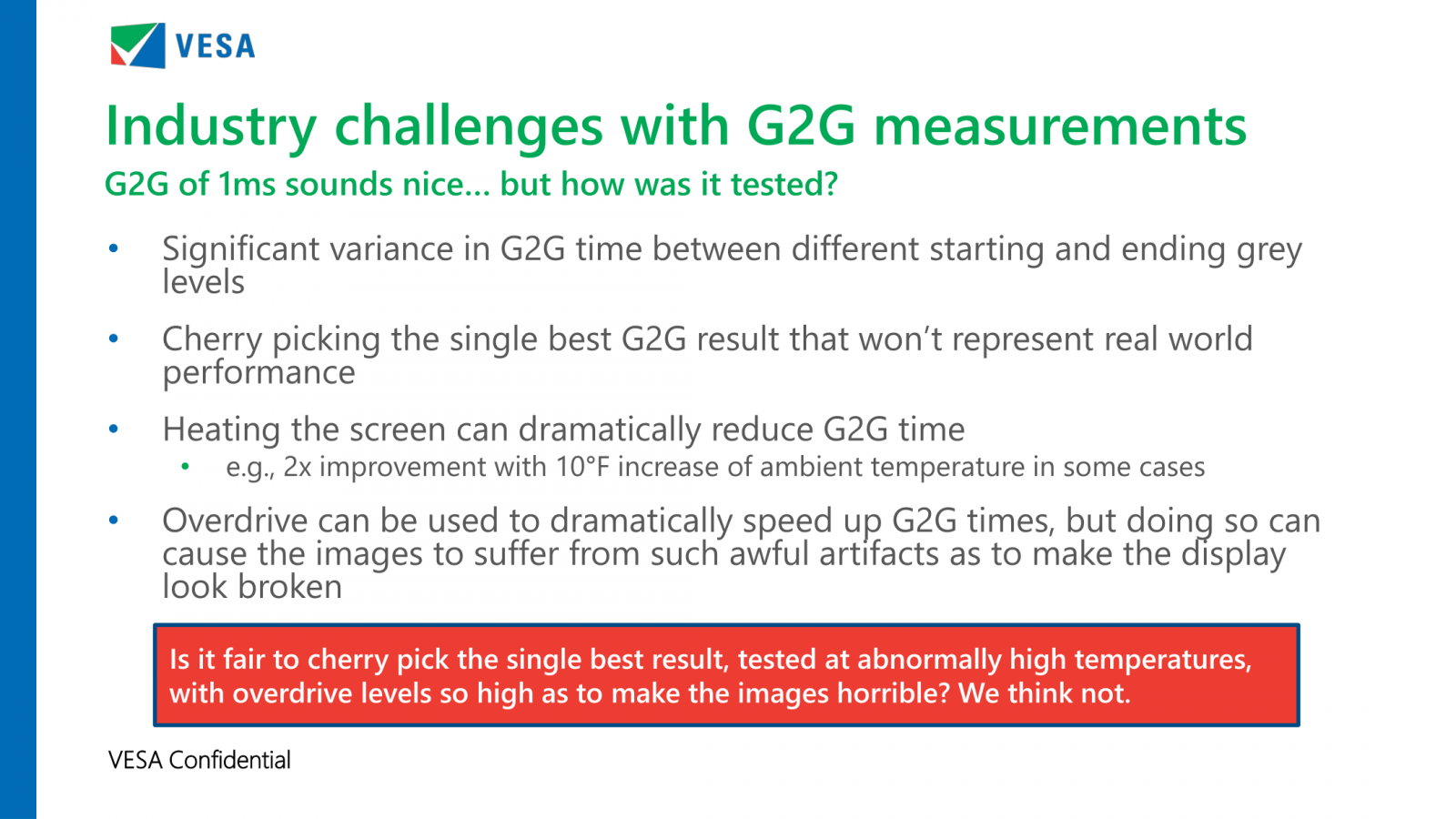 Ainsi, un écran AdaptiveSync devra disposer au minimum d'un taux de rafraichissement variable d'une plage 60 à 144 Hz (il pourra évidemment aller plus bas et plus haut, par exemple 48 - 360 Hz) et le Low Frame Compensation (LFC) est obligatoire ! VESA testera aussi le nombre d'images perdues pour s'assurer à ce que toutes soient bien affichées et il ne pourra y avoir plus de -50 dB de scintillement, peu importe le taux de rafraichissement. VESA s'en prend aussi au temps de réponse gris à gris, souvent mesuré de manière douteuse par les fabricants (préchauffe de l'écran, overdrive...). Cette fois-ci, rien de tout ça ne sera permis et le temps de réponse sera calculé en effectuant la moyenne des résultats de 20 transitions à 5 niveaux différents de gris. Cette moyenne G2G devra être de moins de 5 ms, ce qui sera plus que suffisant pour un écran 144 Hz. Par la même occasion, l'overshoot G2G le plus élevé devra être sous les 20 % et l'undershoot à moins de 15 %. En somme, pas de ghosting ni de ghosting inversé ! Ce qu'il faut retenir aussi, c'est que dans tous les cas, tous les tests seront effectués sur un écran à ses réglages d'usine, aucun overclock d'aucune sorte ni d'aucune forme ne sera accepté.