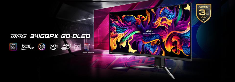 Le MPG 341CQPX QD-OLED est moniteur ultra-large et incurvé (1800R) de 34 pouces. Il affiche une définition maximale de 3440 x 1440 pixels (UWQHD), à un taux de rafraîchissement pouvant s’élever jusqu'à 240 Hz (contre 175 Hz pour le MPG 341CPQ). MSI renseigne un temps de réponse gris à gris de 0,03 ms.