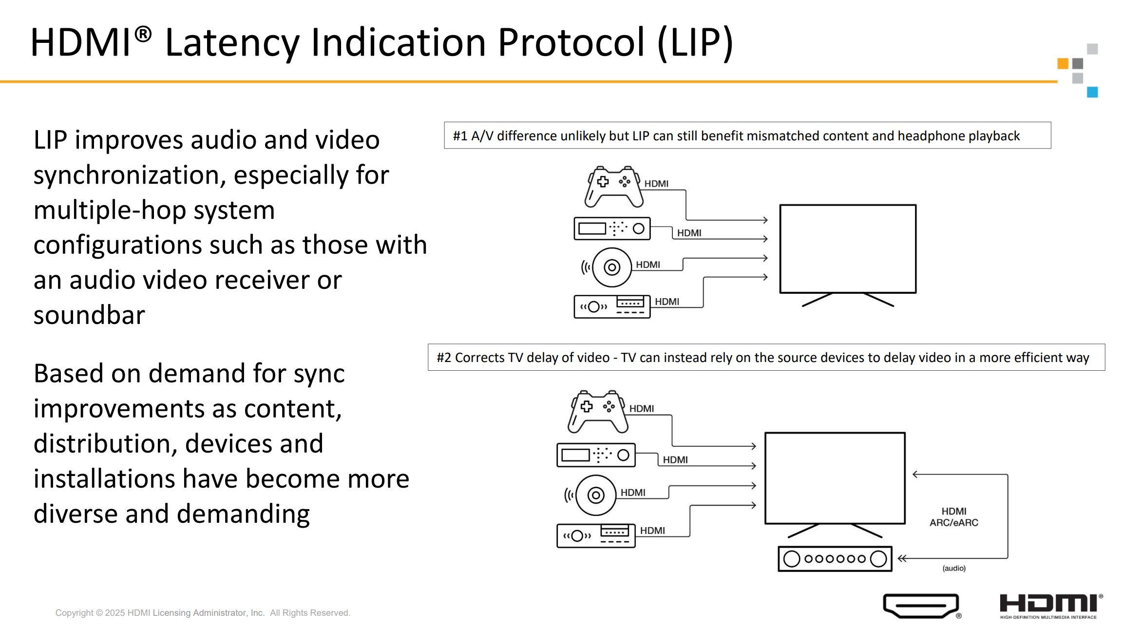 Outre sa bande passante plus élevée, le HDMI 2.2 gomme d’éventuels problèmes de synchronisation audiovisuelle en introduisant le protocole d'indication de latence (LIP). Comme son nom l’indique, ce protocole améliore l'alignement des signaux audio et vidéo, en particulier dans les configurations complexes impliquant plusieurs appareils tels que des récepteurs AV ou des barres de son. Le but est d’éliminer le décalage son / image, forcément très frustrant avec des Home-cinéma ou barres de son.