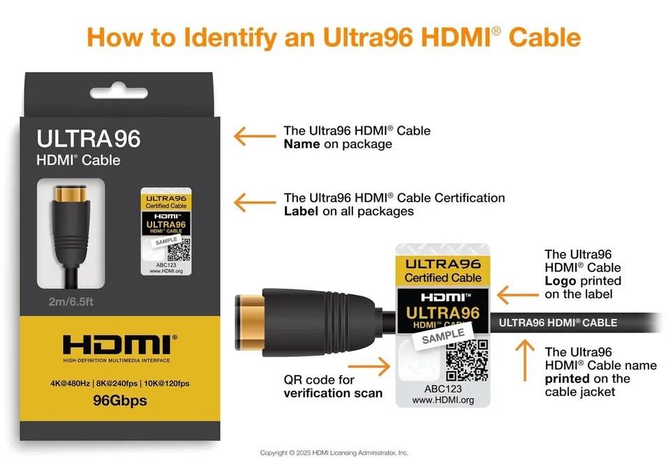 Cette norme implique de nouveaux câbles HDMI « Ultra96 ». Pour garantir l'authenticité et la qualité de ceux-là, le Forum HDMI a mis en place un vaste programme de certification, avec des mesures anti-contrefaçon.