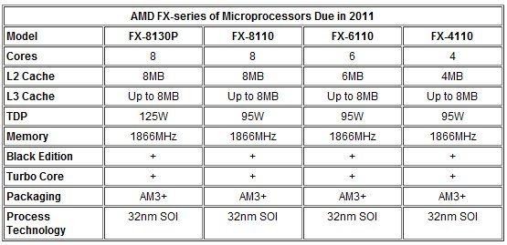 Comme nous vous l'indiquions la semaine dernière, AMD devrait inaugurer sa gamme Bulldozer par 4 références, 4 autres étant attendues pour la fin de l'année. En effet, au mois de juin, on devrait voir arriver selon X-bit labs 2 octocores, 1 hexacore et 1 quadcore. Chacun d'eux aura 1Mo de cache L2 par coeur, faites les comptes, pour le L3, c'est un pwal différent. La compatibilité native avec la DDR3 1866 via le contrôleur mémoire semble de mise, les TDP étant de 95W pour le FX-4110, FX-6110 et FX-8110, tandis que le gros vilain de la bande aura un TDP à 125W. 3 mois grosso modo, et on sera fixés !