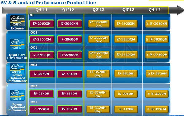 On y découvre qu'Intel a l'intention de remplacer ses 6 modèles actuels de Core i5 et i7 mobiles Sandy Bridge par... 6 versions Ivy Bridge, aucune surprise particulière on aura juste droit à des remplacements directs, sans fioritures. La répartition des gammes ne changera également pas avec un Core i7 Extreme, deux Core i7 quadcores grand public, un dualcore haut de gamme qui gardera la dénomination Core i7 tout de même puis deux Core i5 dualcores plus basiques. A noter que si les 3 quadcores sont attendus pour le mois d'avril, les dualcores devraient eux se faire attendre un mois de plus.