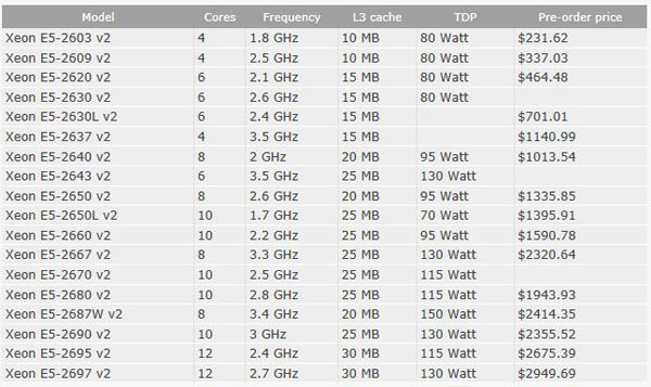 Tout d'abord, si les Ivy Bridge E ne dépasseront pas le cadre de l'hexacore avec hyperthreading, les Xeon monteront à 12 coeurs, 24 threads, avec un maximum de 2.7 GHz et 30Mo de cache L3 pour le plus gros d'entre eux. En revanche, ce qui va refroidir pas mal de monde, sauf les pros aux reins solides qui n'hésiteront pas ou peu à franchir le cap, c'est les tarifs. Le plus petit, le E5 2603 V2 est un quadcore à 1.8 GHz, 10Mo de cache, TDP80W, il coûtera 231$, à l'opposé le plus gros 10 coeurs - le E5 2690 V2 cadencé à 3 GHz et 25Mo de L3 - sera à 2355$, tandis que le plus gros de tous le E5 2697 V2 sera lancé à 2949$. Ca pique un tantinet, mais c'est le prix pour avoir des processeurs triés ayant des courants de fuite bien moindres que les équivalents "grand public" ! (Source CPU World)