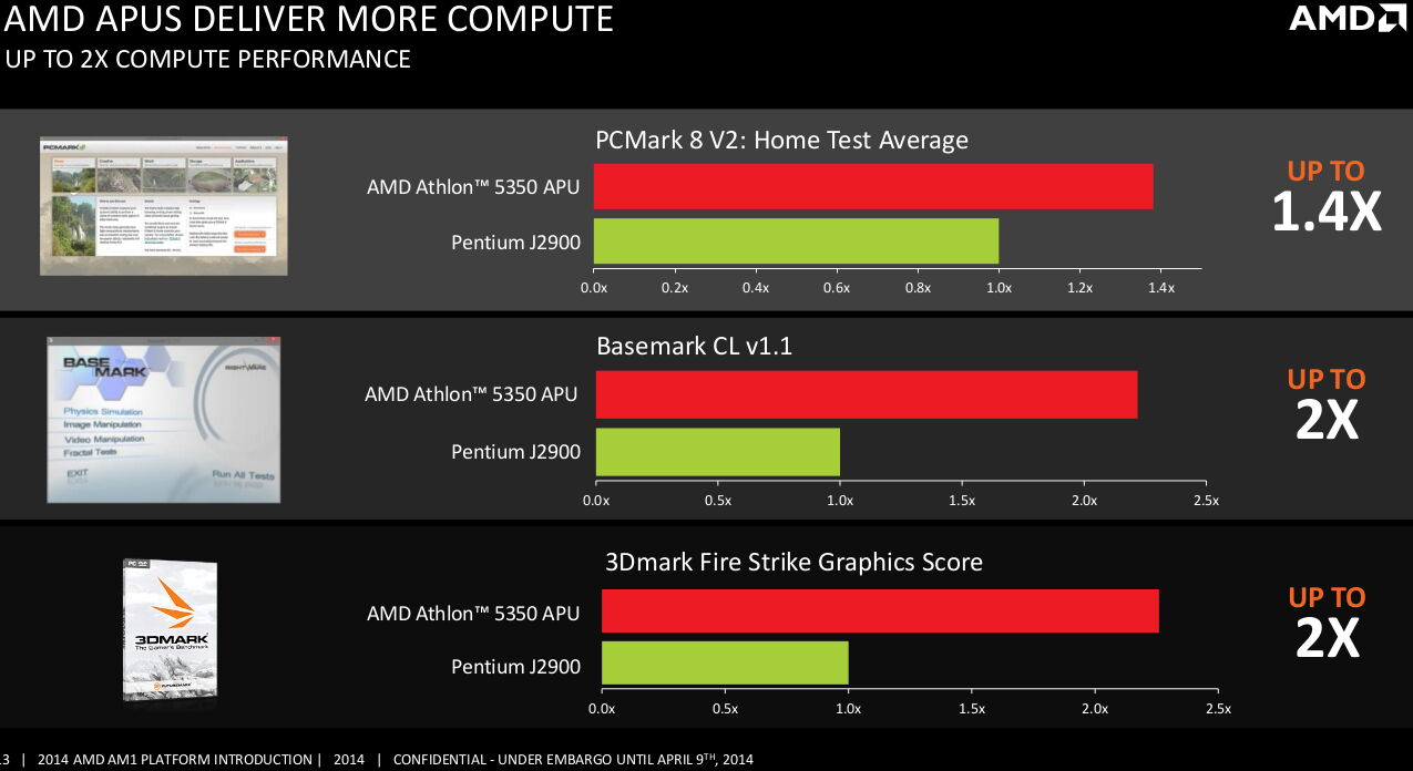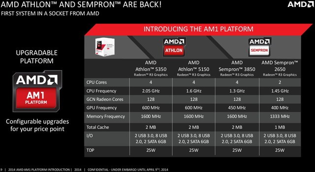 Quatre coeurs Jaguar, un GPU GCN, 2Mo de cache L2, DDR3 à 1600MHz. Le Sempron 2650 n'a lui que deux coeurs Jaguar et ne supportera que de la DDR3 à 1333MHz, vous n'avez qu'à griser les parties en trop pour le voir tout nu aussi. Ces bestiaux sont de sérieux concurrents aux puces Celeron et Pentium Bay Trail-D d'Intel, ils n'ont d'ailleurs pas manqué les occasions de le rappeler, comme c'est de bonne guerre, pendant la présentation.