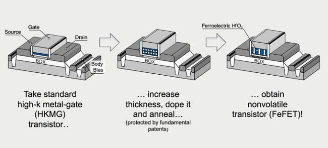 Cependant un nouveau type de transistor basé sur les propriétés de l'oxyde d'hafnium, appelé FeFET (rien à voir avec le FinFET), a été développé ces dernières années. Toujours dans un stade de prototype, l'idée consiste à réutiliser un transistor logique et augmenter fortement la taille la grille (gate) en réutilisant le matériau ferroélectrique déjà présent, en plus grande quantité.