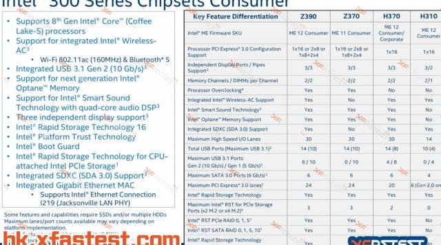 D'un autre côté, l'un des documents (ci-dessous) confirmerait aussi la compatibilité déjà largement soupçonnée de tous les chipsets de série 300 avec les futurs processeurs Intel iX-9000, quelle que soit la gamme du chipset ou du processeur. C'est aussi l'occasion de voir (ci-dessus) tous les chipsets d'Intel côte à côte et de comparer leurs fonctionnalités, et accessoirement de constater une nouvelle fois que les évolutions du Z390 n'auraient vraiment rien d'extraordinaire.