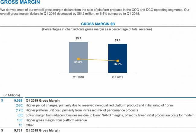 Les résultats d'Intel pour le premier trimestre de 2019 ont été publiés l'autre jour, marquant définitivement la fin d'une année 2018 qui fut assez spectaculaire sauf pour son 4e trimestre et le début d'une période à la courbe moins folle et plus linéaire, voire piquant un peu du nez. L'un des chiffres racontait notamment l'histoire d'une marge brute qui passait aussi de 60,6% à 56,6% sur une période de 1 an, rien de réellement catastrophique en ce qui nous concerne et qui n’empêchera certainement personne ici de dormir.