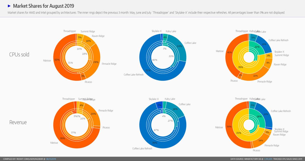 Jusqu'à présent, AMD et Intel faisaient jeu égal à quelques pourcents près, avec un avantage relativement faible pour les rouges. Le cador d'ailleurs se nommait R5 2600 avec des pics de vente de novembre 2018 à mars 2019. Les baisses de prix ont permis à cette puce de continuer à marcher, mais depuis le mois de juillet et l'arrivée des Zen 2, les rapports de force entre AMD et Intel ont été éclatés. AMD se vend entre 72 et 75% alors qu'Intel se contente de 25 à 28%.