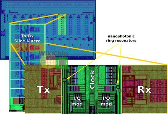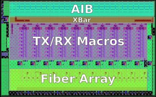 L'architecture est basée sur l'interface AIB pour la communication entre les chiplets, qui est un système certes venant de chez Intel, mais libre de droit et pourra donc être utilisé par d'autres fabricants à l'avenir sur les FPGA. Le TeraPHY intègre donc 24 canaux de cette interface, avec 20 signaux d'émission et 20 signaux de réception par canal, pour 1 GT/s sur chaque point sur le TeraPHY. C'est donc un signal "lent" mais divisé sur plusieurs branches, permettant au total 960 Gb/s en théorie tout de même. Pour réaliser l'exploit, le signal électrique est divisé en macros - qui représente les signaux d'émission/réception - qui passent au travers d'un système de modulation de signaux lumineux dans une fibre optique. Cette fibre peut contenir - grâce à la magie de la physique de la lumière - jusqu’à 8 longueurs d'ondes différentes sans encombre, qui transmettent chacune jusqu'à 32 Gb/s, ce qui fait que chaque macro peut transmettre jusqu'à 256 Gb/s sur sa fibre... ce qui est largement au-dessus de la capacité du canal AIB.