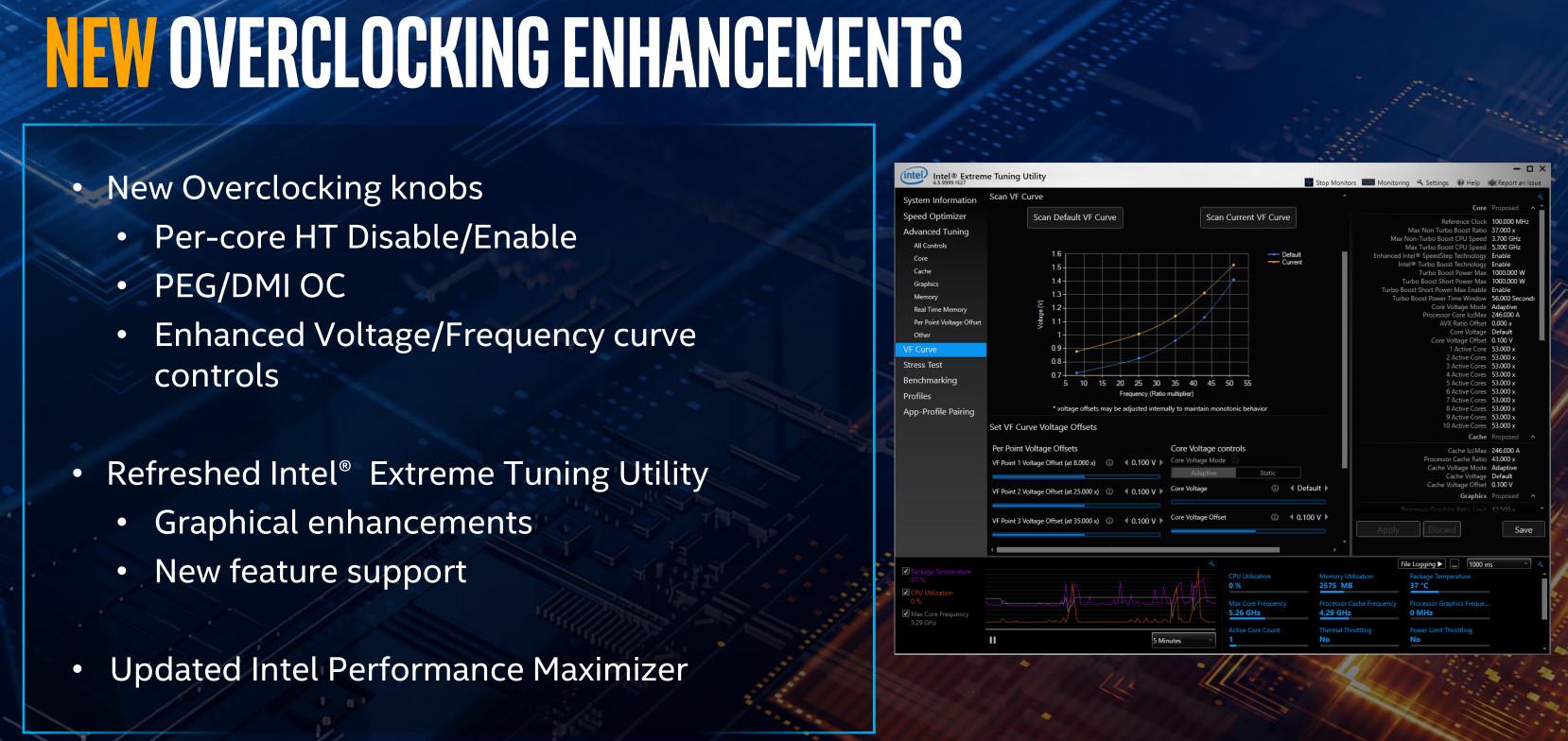 C’est là que se pose la question fatale : est-ce que le PCIe 4.0 est supporté ? La réponse est non... Mais Intel compenserait avec de nouvelles fonctionnalités d’overclocking : outre l’HyperThreading désactivable par cœurs qui est, honnêtement, la dernière chose qui nous intéresse, l’interface entre le chipset et le CPU est overclockable (le fameux lien DMI), tout comme les liaisons PCIe avec la carte graphique. Est-ce que cela sera compatible avec les contrôleurs PCIe 4 ? Est-ce que cela est utile ? Mystère pour la première question et très probablement non pour la seconde, voilà ce à quoi nous nous attendons en tests ! De plus, l’utilitaire Intel XTU verrait de nouvelles mises à jour, dont un SDK librement accessible permettant le développement de solutions tierces de surcadençage pour qui cela tente. Pourquoi pas, après tout.
