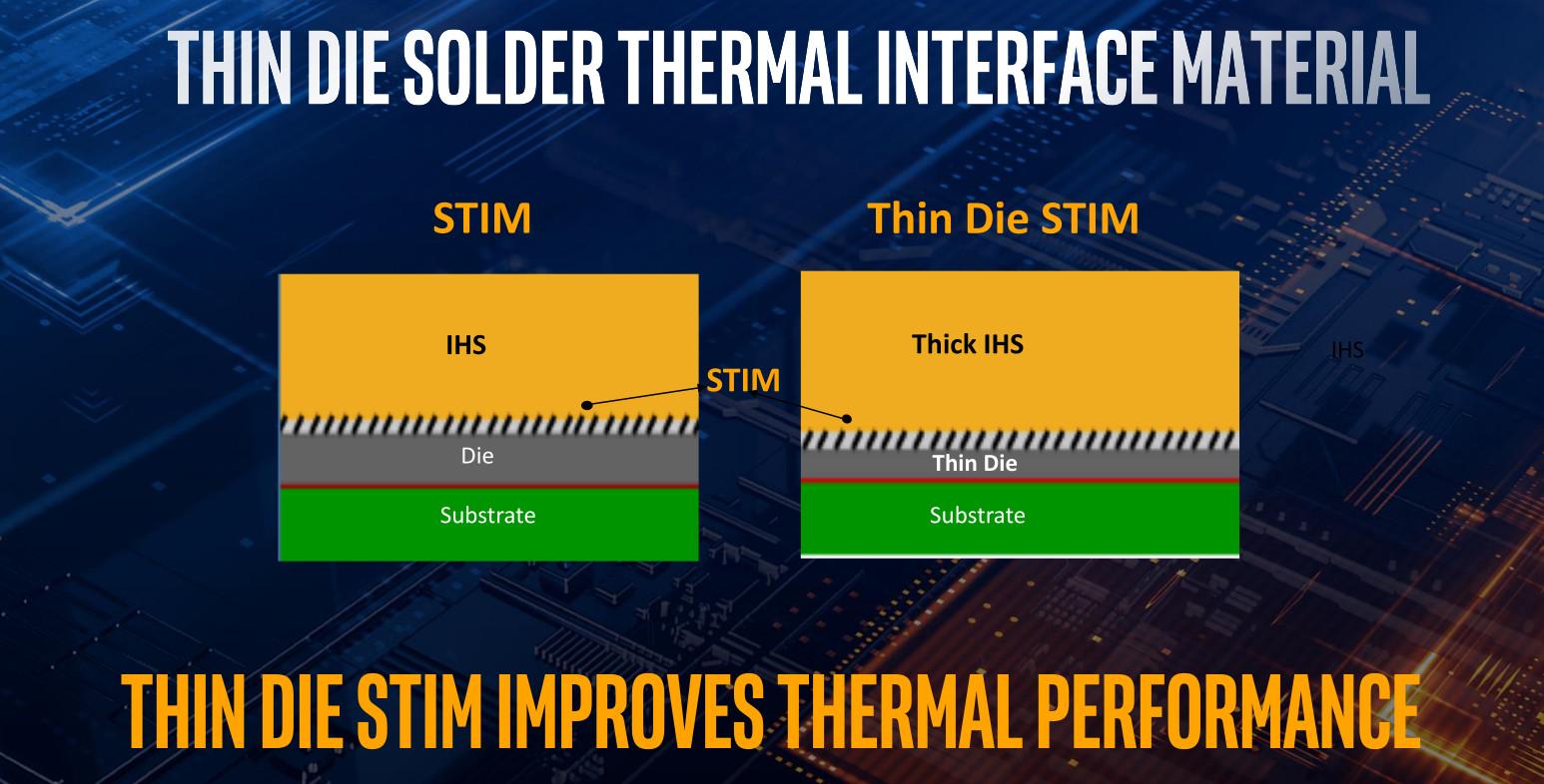 Dans la même veine que les Comet Lake mobiles, un Thermal Velocity Boost ira encore davantage overclocker si les températures le permettent (le palier n’est pas dévoilé, mais devrait tourner autour des 60 °C ou 65 °C). Ici encore, il ne s'agit que de 100 MHz, et c'est ainsi qu'Intel affiche 5,3 GHz = 5,1 GHz + 100 MHz + 100 MHz en fréquence maximale sur le 10900K. Le support officiel de la DDR4 passe également à 2933 MHz, une fausse nouvelle puisque le contrôleur de Skylake s’accommodait très bien de mémoires bien plus véloces. Enfin, le die des CPU soudés serait désormais plus fin d’environ 200 µm pour une dissipation thermique améliorée, l’espace vide étant comblé par l’IHS, en cuivre, dans un souci de compatibilité avec les refroidisseurs existants. Et, dans la transparence la moins totale, nous ne connaissons bien sûr pas les modèles concernés, bien que cette optimisation soit très probablement limitée aux versions K (les autres devant se contenter de la pâte thermique Nutella classique de la firme ?).