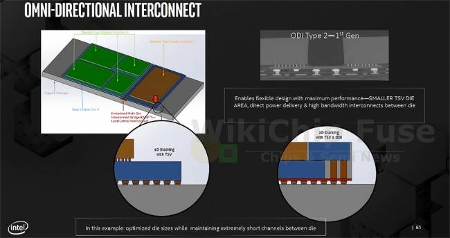 Teasé par les bleus l'été dernier, le système permet d'empiler directement les différents dies les uns sur les autres sans passer par un interconnect quelconque, avec deux types : le OD1, qui se base sur un empilement partiel afin de garder des surfaces de dissipation de chaleurs - dans le cas de la création d'un pont entre deux puces puissantes - et le OD2, qui met des puces plus petites entièrement sous la puce principale, ce qui peut être utile dans le cas de connexions plus directes, comme les contrôleurs mémoire ou les gestions des I/O. Les deux méthodes peuvent être utilisées en même temps afin d'améliorer l'efficacité globale et de créer des montages totalement en 3D.