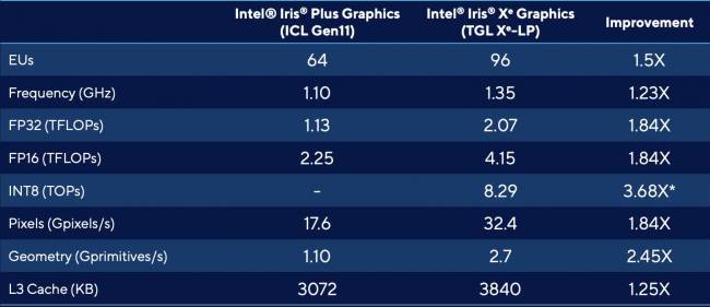 Comme entamé avec Ice Lake, le dernier chiffre (suivant le « G ») indique la puissance du GPU, avec un choix réduit entre G4 (48 EU) et G7 (80 ou 96 EU). Notez que le « G1 » disparaît, et que le nombre minimum de cœurs graphique bondit de 32 à 48, alors que le maximum monte en flèche en passant de 64 à 96 EU.