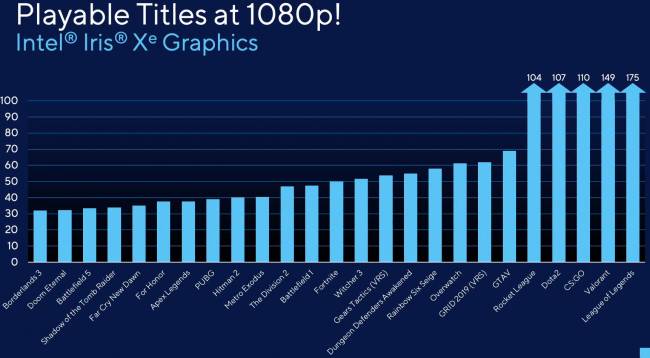 Avec de telles spécifications, le marketing présente ces CPU comme des SoC (System on Chip, soit un ensemble de CPU, GPU et autres contrôleurs) capables de performances alléchantes en jeu... lorsque ce dernier est lancé sur l’iGPU. Pour les PC portables au GPU dédié, il faudra donc repasser, mais nous n’attendions pas vraiment mieux d’un die à 4 cœurs physiques maximum, même si les fréquences atteignent, cette fois-ci, un niveau satisfaisant sur le papier : 4,8 GHz en boost, même sur un cœur uniquement, voilà qui est dans la fourchette de nos habitudes. Côté GPU, 1,25 GHz reste un cran en deçà de la concurrence, mais il faut garder à l’esprit les contraintes thermiques... et le fait qu’un iGPU soit souvent fortement bridé par la vitesse de la RAM. À voir ici comment Intel y tire son compte par rapport aux iGPU VEGA de Renoir.