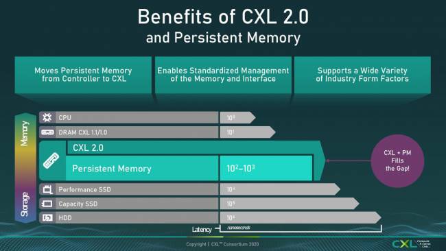 Nous resterons du côté de la mémoire pour la suite, en nous intéressant à comment les différentes technologies cohabitent sur cet environnement. Du fait de l'apparition des mémoires dites persistantes - celles qui sont entre la RAM et les SSD, à l'instar des disques Optane en 3D XPoint - une révision était nécessaire afin de les intégrer dans la gestion du stockage dans le protocole. Plutôt que de se baser sur une dépendance vis-à-vis d'un contrôleur dédié - coucou Intel ! - le consortium a mis au point une gestion standardisée pour ces disques, afin de les rendre plus réactifs et versatiles : les applications pourront les utiliser soit comme une extension de la RAM, soit comme un stockage très rapide, selon les besoins.