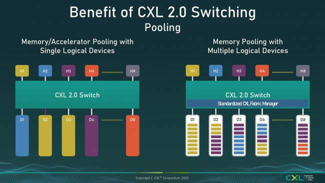 L'autre avantage se situe dans les accès mémoires des périphériques, puisque ces switchs permettent d'utiliser du pooling : plutôt que d'attribuer telle mémoire à tel host - CPU, GPU, FPGA... - les besoins sont répartis indépendamment, ce qui permet d'optimiser la quantité de mémoire utilisée, ainsi que d'améliorer les temps de latence en répartissant sur plusieurs lignes une même entité, sans que cela perturbe les autres. Pour faire court et simple : moins de RAM utilisée et plus de vitesse, le tout qu'importe le type de client ou d'host qui se trouve dans votre machine. Une fonctionnalité intéressante pour les datacenter, car ce système peut fonctionner entre des serveurs.