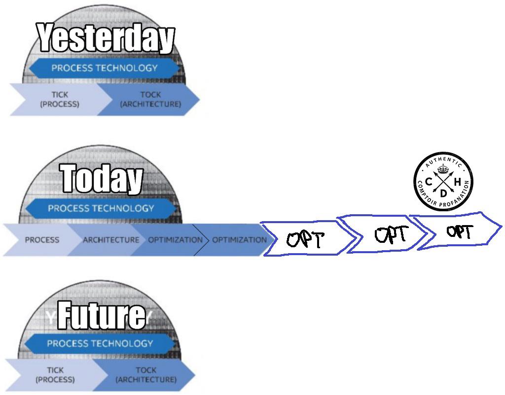 C'est ainsi que le fameux modèle Tick Tock devrait faire son grand retour dans la manière de travailler du fondeur, Pat étant convaincu que c'est précisément ce modèle qui avait permis à Intel de rester au sommet pendant si longtemps, ça, et puis par le soutien d'une roadmap claire et précise. Pour le p’tit historique, Tick Tock avait été officiellement nommé et adopté en 2007 (mais existait déjà auparavant d'une certaine manière) par Intel après les débuts de l'architecture Core. Chaque Tick représentait le passage à un nouveau procédé de gravure et le Tock l'introduction d'une nouvelle microarchitecture. Une stratégie abandonnée en 2016, au profit d'un modèle basé sur des cycles d'optimisation, marqué par le très long cycle de vie de Skylake et du 14 nm, une histoire d'immobilisme que nous connaissons tous très bien.