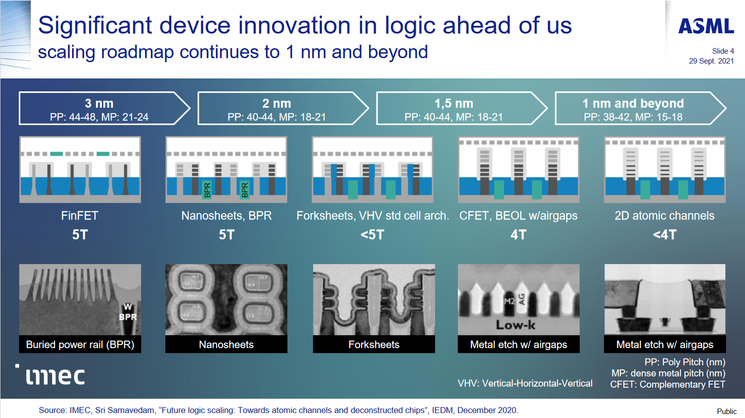 C'est certainement un objectif ambitieux, mais aussi une base sur laquelle la compagnie va établir sa stratégie pour l'avenir et avoir une idée relativement précise du chemin à suivre, au moins en apparence. Dans les grandes lignes, il s'agira de séparer le processus de développement en deux phases, la première pour augmenter la densité de transistor et la deuxième pour améliorer le packaging, avec un cheminement précis pour chaque phase. Nanofeuilles FET et lithographie EUV seront ainsi le combo de choix pour arriver à augmenter encore la densité avec les nodes après-5 nm, notamment 3 nm et 2 nm. Ça sera plus ardu avec le 1,5 nm, pour lequel des nanofeuilles fourchues seront indispensables, tandis que les transistors en 1 nm seront basés sur la technologie Complementary FET. Sous la barre des 1 nm, l'industrie se tournera cette fois-ci vers du semiconducteur 2D et ses épaisseurs à l'échelle atomique.
