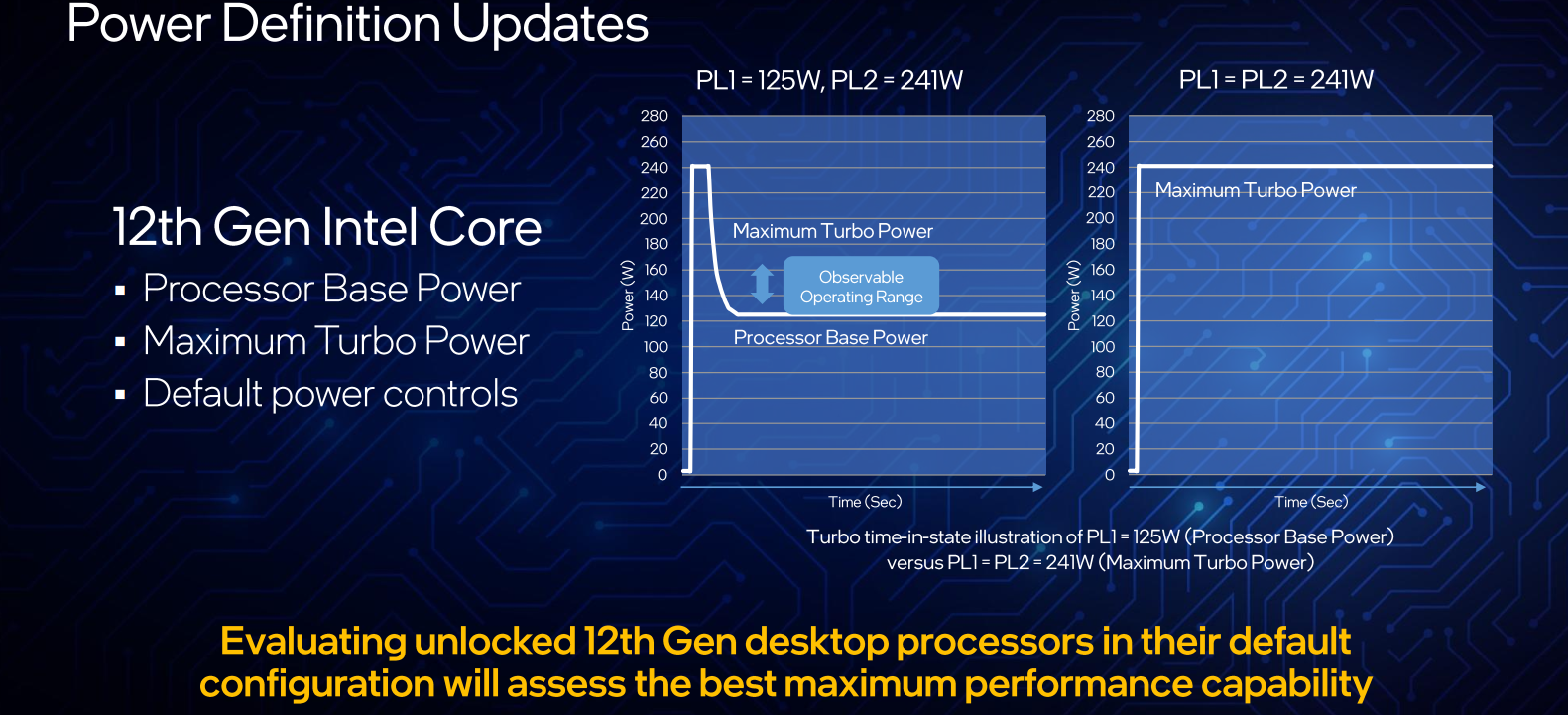 Rien de bien surprenant : du 8+8 cœurs maximum, mais, surtout, une fréquence de 5,2 GHz annoncée en Turbo Boost 3, Intel ayant même communiqué sur « des surprises en overclocking », nous avons hâte de vérifier tout cela en test. Pour le reste, les prix sont loin d’être aussi atomiques que ce que certains pressentaient, et c’est tant mieux ! Par contre, niveau chauffe, il va y avoir de quoi passer l’hiver tranquillement : avec 241 W en PL2 (nouvellement renommé Maximum Turbo Power), Alder Lake n’est pas tellement plus économe que le Rocket Lake précédent... mais Intel assume ouvertement cette consommation. Pire, la firme laisse tomber la fenêtre de temps tau du turbo, et autorise officiellement ses CPU — K seulement... – à conserver indéfiniment leur enveloppe thermique PL2.