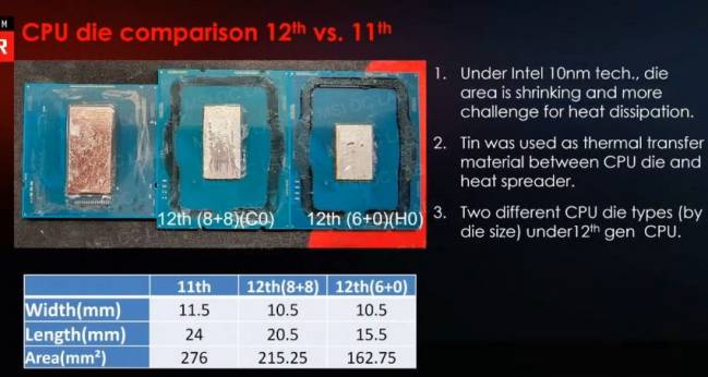 En effet, après avoir déliddé, ou ouvert au couteau suisse, un CPU 8P+6E et un 6P+0E, que l'on retrouvera dans le 12900K et tous les i5 excepté les 12600K/KF, ils se sont rendu compte qu'il y avait deux dies bien différents. Le premier, le plus gros, mesure 216 mm² (ou 209 selon Intel mais sans précision), tandis que le second est plus petit avec 163 mm². Cela implique donc d'usiner au moins deux puces différentes, la présence ou l'absence des coeurs E étant probablement la problématique ayant entrainé ce choix. Ce n'est pas une annonce révolutionnaire, mais ça explique des choses, qui ne préfigurent en rien des perfs des CPU d'ailleurs, culture perso pour geek afin briller en société !