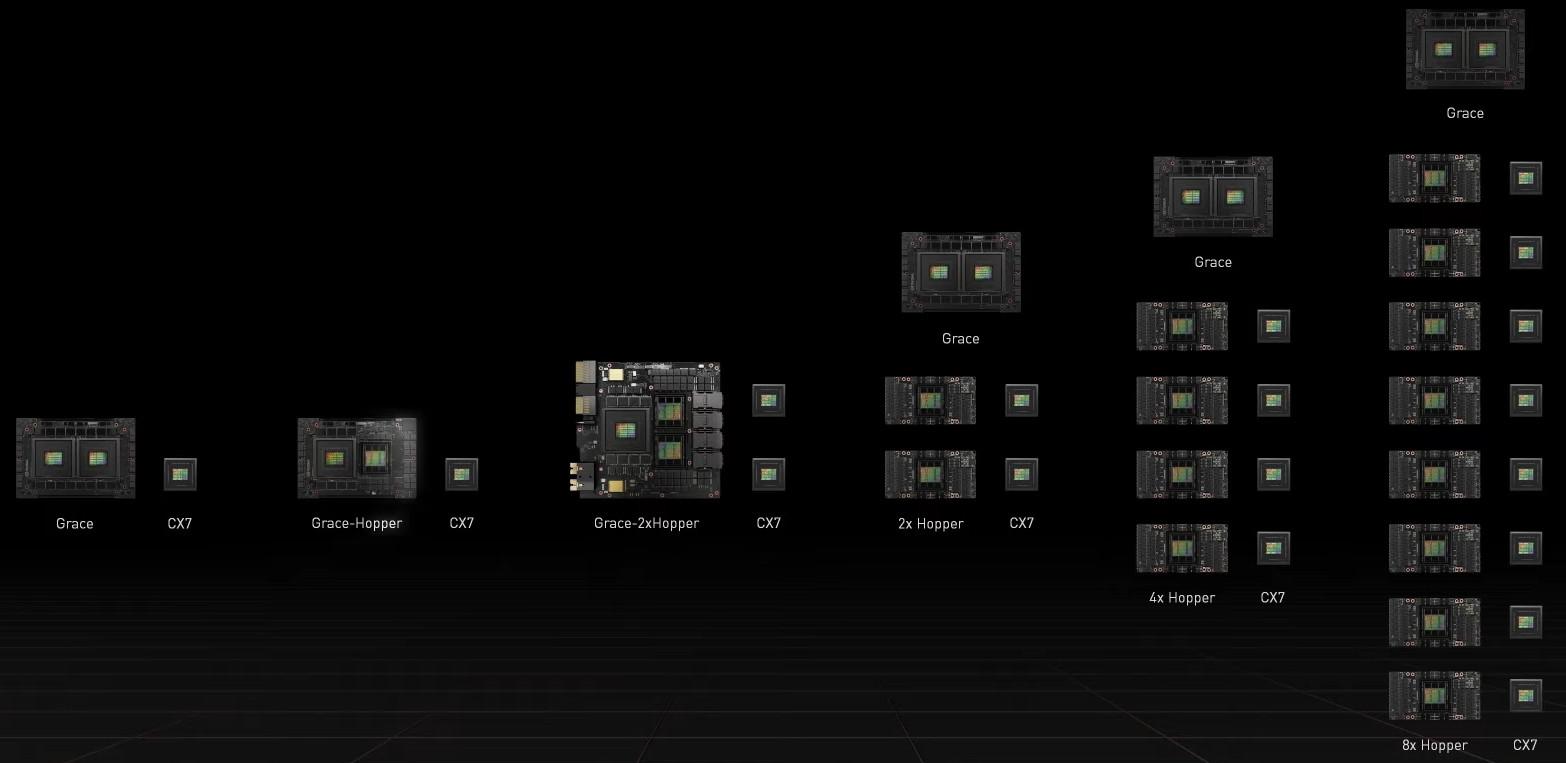 Une version Grace Hopper (quelle surprise, vu les noms, personne ne s’en serait douté…) du Superchip est également au programme, troquant simplement le second Grace par un GH100 tout en conservant la bande passant faramineuse de 900 Gio/s histoire de bien mettre en commun les données à traiter. En cas de besoin, Grace est également configurable pour contrôler jusqu’à 8 GPU Hopper par Superchip, à condition des les jumeler avec un contrôleur réseau Mazda CX7 : de quoi faire rêver les amateurs de machine learning, avec une configuration qui n’est pas sans rappeler les mobales blindées de slots PCIe à destination des mineurs. Enfin, notez la présence sous un PCB unique de deux Hopper pour une Grace, une solution potentiellement avantageuse pour accélérer ses calculs dans un format "réduit" tout en faisant usage des toutes dernières technologies des verts.