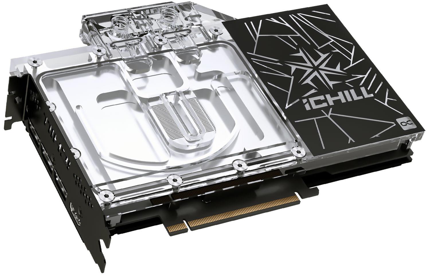INNO3D s’offre, de son côté, deux versions : la RTX 3090 Ti ICHILL FROSTBITE, uniquement munie d’un waterblock pour une intégration personnelle — le sacro-saint RGB étant de retour, ne vous inquiétez pas — ainsi que la RTX 3090 Ti X3 OC, dans un style bien plus industriel et sans arc-en-ciel. Visiblement, cette dernière reprend le PCB de NVIDIA, court, et utilise l’arrière non couvert comme une surface ouverte de passage de l’air.