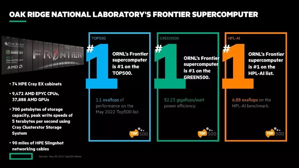Avec ses 9472 EPYC et 37888 MI250X, Frontier prend la tête du zizithon 2022 ! |