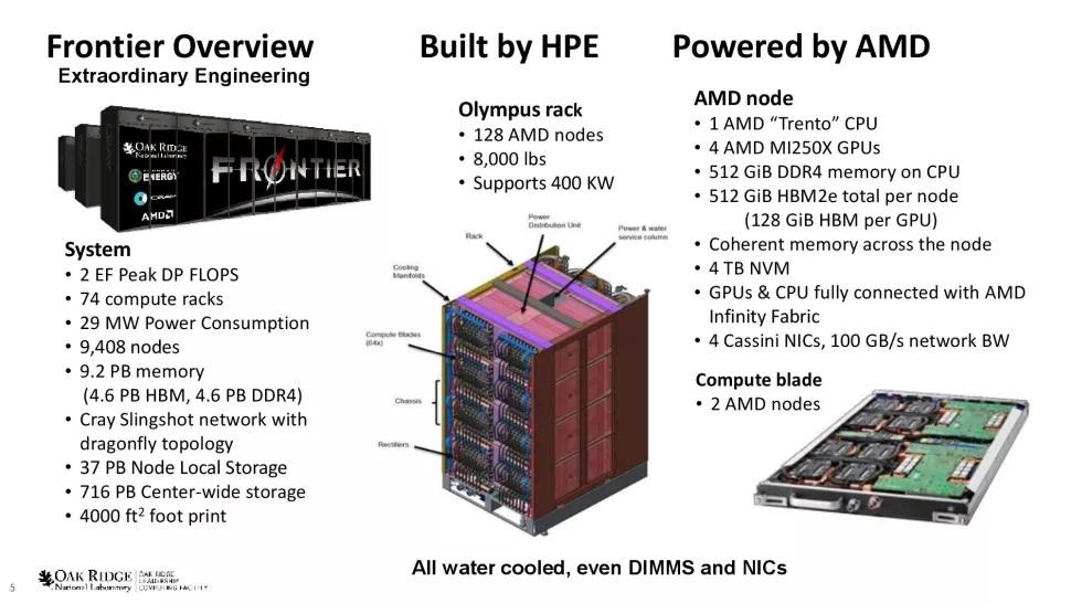 Frontier était au programme depuis plusieurs années déjà, mais son déploiement n'avait commencé que l'année dernière, et en ces temps difficiles pour l'approvisionnement du semiconducteur, vous imaginez bien que ce ne fut pas une mince affaire que de sourcer les 60 millions de composants et leurs 685 références différentes pour l'assemblage du système. Heureusement, Frontier, fort de son ambition de devenir le premier superordinateur exascale des USA (et au monde), de son importance pour la défense nationale et de son commanditaire, l'Oak Ridge National Laboratory (ORNL), put profiter de tout le soutien du gouvernement US, qui mit en œuvre le Defense Act pour sourcer illico presto tout le nécessaire. Ce fut fait et voici que Frontier est désormais pleinement opérationnel !