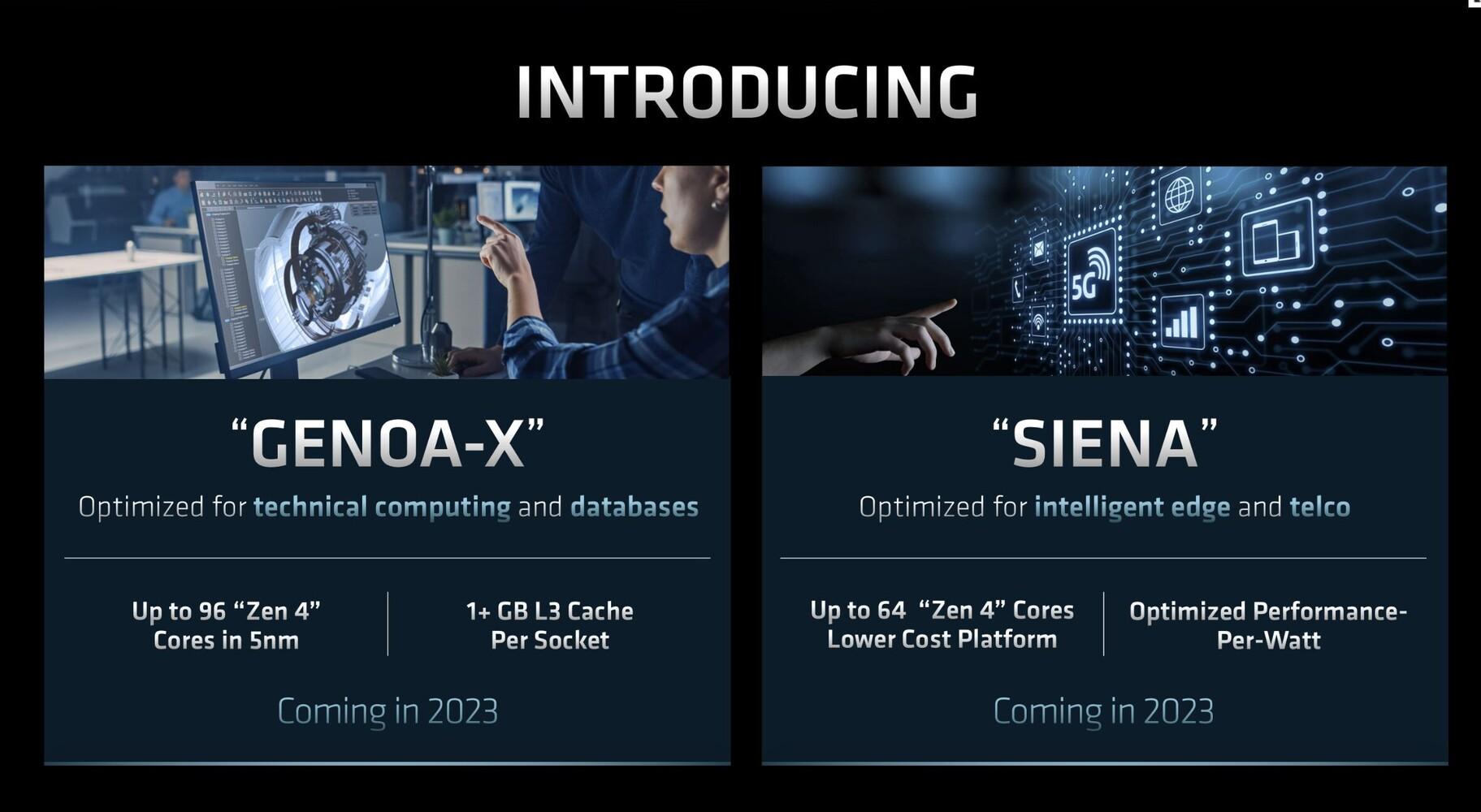 Puisqu'on en est à parler de la puce épique, rappelons qu'en parallèle des EPYC généralistes Genoa arrivera aussi Bergamo basé sur Zen 4c, une solution spécialisée cloud computing devant embarquer des capacités et fonctionnalités supplémentaires. En sus, AMD a ajouté un 4e et dernier membre a cette 4e génération EPYC, il s'agit de Siena ! Prévue également pour 2023, sa cible sera l'industrie de l'edge computing et de la télécommunication, avec un ratio performance/watt optimisé et jusqu'à 64 cœurs Zen 4. L'intention est de proposer une plateforme à cout réduit, a priori pour s'attaquer tout particulièrement à l'infrastructure 5G. Bref, très gros programme EPYC pour 2023 ! La suite, c'est en 2024 avec la 5e génération EPYC et la famille Turin pour commencer.