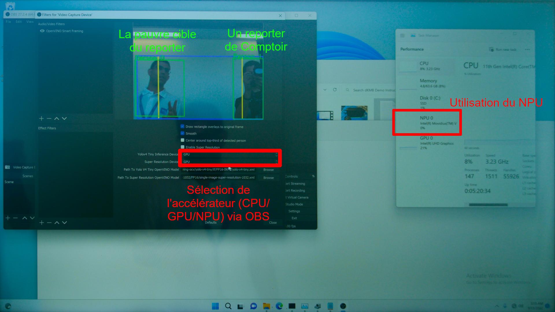 Si les détails techniques sont encore tenus secrets, la dernière génération est actuellement capable d’exécuter des réseaux simples de reconnaissance d’image en temps réel tels que YOLOv4 (poids en FP16 et activation en INT8) en temps réel via les 4 TLOPS casés dans un TDP de seulement 1,5 W dans un format clef USB ou carte PCIe. Pour un CPU d’une cinquantaine voire une centaine de Watts, vous comprendrez la pertinence de l’intégration ; d'autant plus que ce dernier gère nativement les connexions sur bus PCIe. Mieux, l’expérience de Movidius permet un support stable et mature de la solution, avec une entrée dédiée dans le gestionnaire de tâches en ce qui concerne son utilisation et une compatibilité avec le populaire logiciel de capture vidéo OBS. De quoi pouvoir décharger le CPU et/ou le GPU lors de l’utilisation de filtres et autres zoom automatique de la zone visible (une fonctionnalité chère à Apple) : un plaisir pour les streamers !