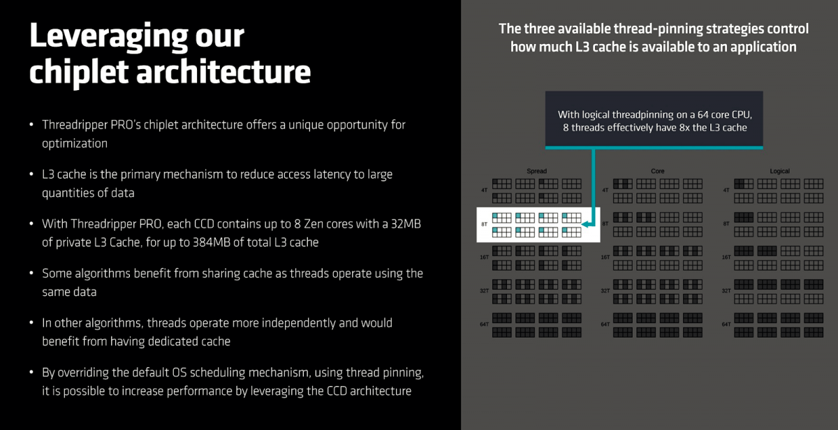 Autre conséquence de la conception en chiplets, les latences induites inter-CCDs, qui peuvent s'avérer fortement pénalisantes sur certains cadres de charge. La série 7000 intègre à cet effet un mécanisme déjà connu de thread pinning censé outrepasser l'ordonnanceur de l'OS pour désigner quels seront les CCDs concernés pour une opération donnée et comment sera répartie le charge, pour ainsi optimiser au mieux le débit en sortie du cache L3. Il s'agit là, à priori, d'une optimisation via une API qui devra être spécifique à chaque logiciel pour lui définir les affinités des cœurs : un outil à double tranchant, mais qui à le mérite d'apporter un début de réponse.