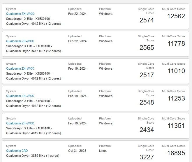 Concernant l’authenticité de cette apparition, il y a quelques incohérences en matière de cœurs CPU et de fréquence. Cependant, la recherche « Qualcomm Oryon » aboutit à 24 résultats, dont 6 récents sous Windows (le premier date du 19 février) ; ils sont tous cohérents. Les autres entrées remontent au 31 octobre 2023, soit quelques jours après l’annonce officielle. Celles-ci sont toutes sous Linux, à l’exception d’une sous Windows. Les scores tournent autour de 3200 / 17 200 points pour les premières, tandis que nous avons 2704 points et 13 021 points sous Windows pour le tout premier test référencé.