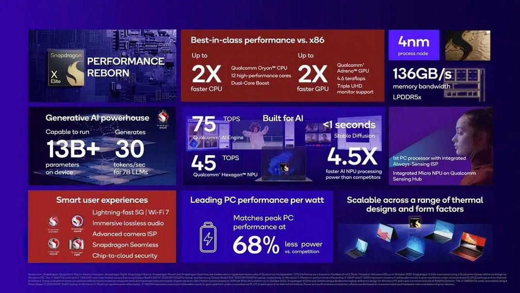 La firme américaine n’avait pas manqué pas de superlatifs pour vanter sa création. Dans le communiqué de presse, publié au moment de l’officialisation et signé Don McGuire – vice-président senior et directeur du marketing de Qualcomm – ce dernier avance que « 2024 sera un point d’inflexion pour l’industrie du PC » en raison de l'apparition de ce processeur. D’ailleurs, pour bien marquer la rupture avec les précédentes générations, Qualcomm a renommé sa plateforme ; elle était jusqu’alors baptisée Snapdragon 8cx.