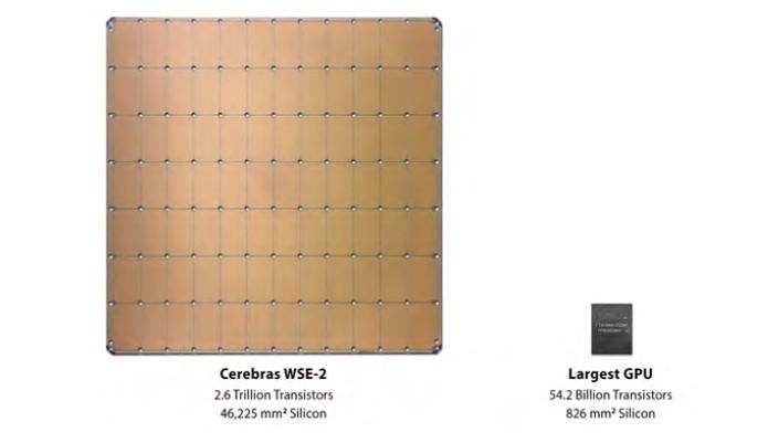 La société se livre à cette comparaison depuis la toute première version du WSE. Si la surface n'évolue pas au fil des ans, le nombre de transistors est logiquement en hausse perpétuelle à mesure que la finesse de gravure s'affine : 16 nm, 7 nm, puis 5 nm désormais.