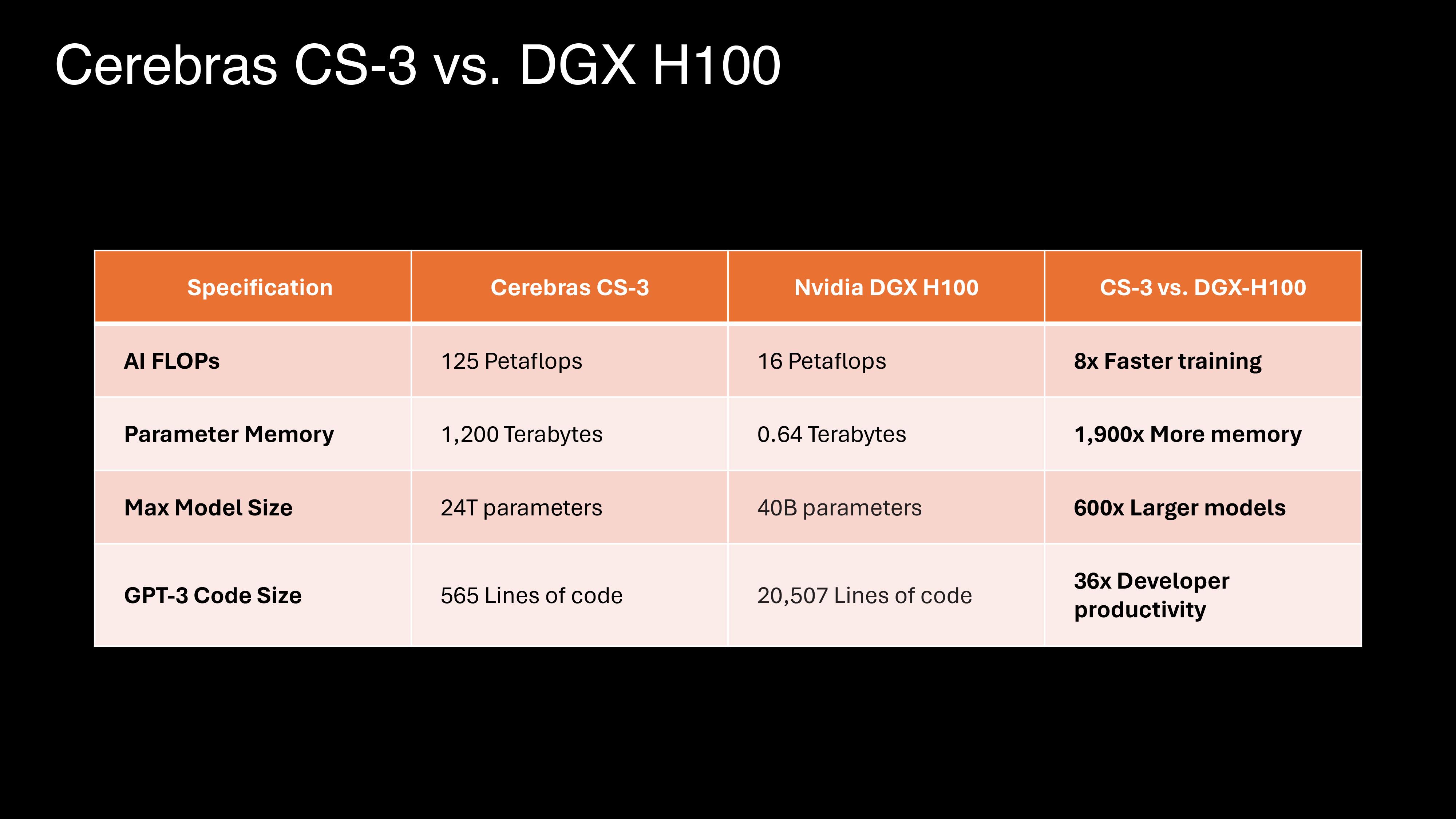 Comme l’explique l’entreprise dans son communiqué de presse, l’énorme système de mémoire du CS-3 est conçu pour former des grands modèles de langage (LLM) de nouvelle génération ; jusqu’à 10 fois plus grands que GPT-4 ou Gemini. Cerebras argue que « l'apprentissage d'un modèle à un billion de paramètres sur le CS-3 est aussi simple que l'apprentissage d'un modèle à un milliard de paramètres sur les GPU ».