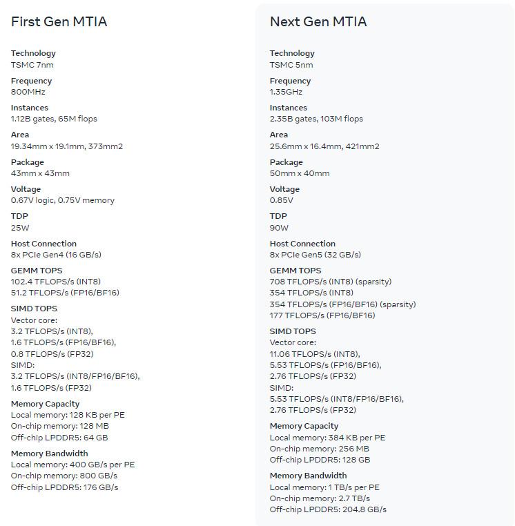 La nouvelle puce de Meta a une surface de 421 mm² contre 373 mm² pour l’ancienne ; le TDP bondit de 25 W à 90 W, et la fréquence de 800 MHz à 1,35 GHz. La production est toujours confiée à TSMC, mais en 5 nm plutôt qu’en 7 nm.
