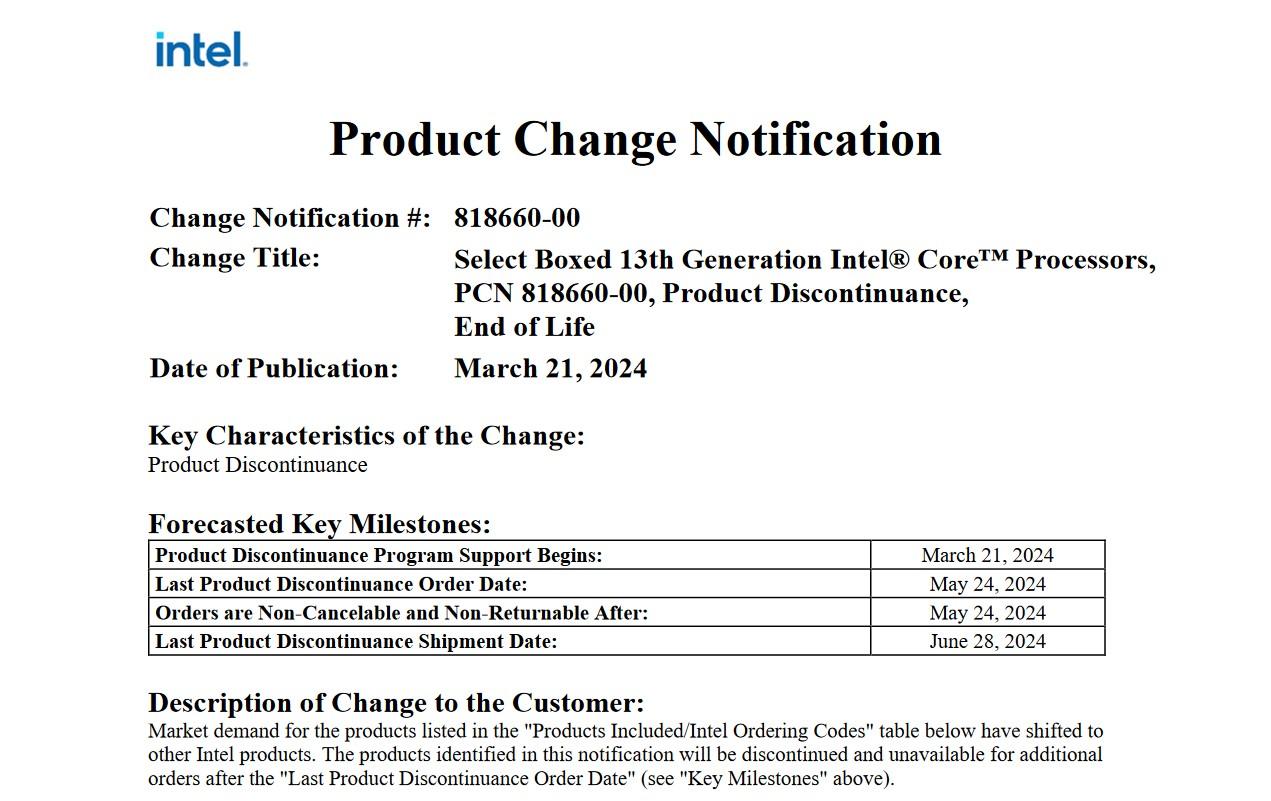 Les funérailles des processeurs se font souvent dans la discrétion ; celles des Raptor Lake déverrouillés ne dérogent pas à cette tradition : sans fanfare, Intel a officialisé la fin de ses Core overclockables de 13e génération. Ils sont en sursis jusqu’au 24 mai 2024, jour d’échéance des ultimes commandes par les détaillants.